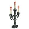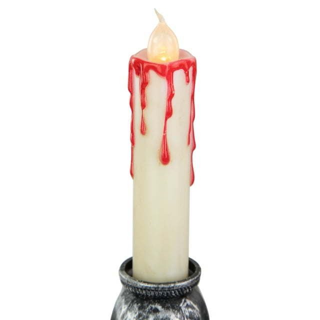 Create a perfect mysterious and slightly spooky atmosphere with this skull candelabra. This candlestick has 3 skeleton heads with flameless LED candles. The candles are white with a dripping red wax accent and the bulb is a flickering amber color. It would be perfect to display on a mantle windowsill or on a tabletop.