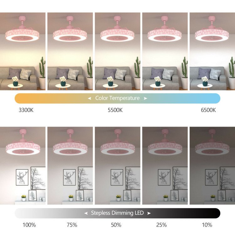 The beautiful hollow-out starry lampshade is a perfect addition to your homeStepless dimming technology allows you to freely adjust the brightness of the lightThe motor runs quietly without noise to create a comfortable sleeping environment3 colors (warm light; natural light; white light) create a different atmosphere3 fan blades are hidden inside the lampshade to prevent accidentally cutting3 wind speeds can be adjusted according to your needsComes with a remote control for your convenienceIdeal for the living room; bedroom; dining room and so onEasy to assemble with detailed instruction