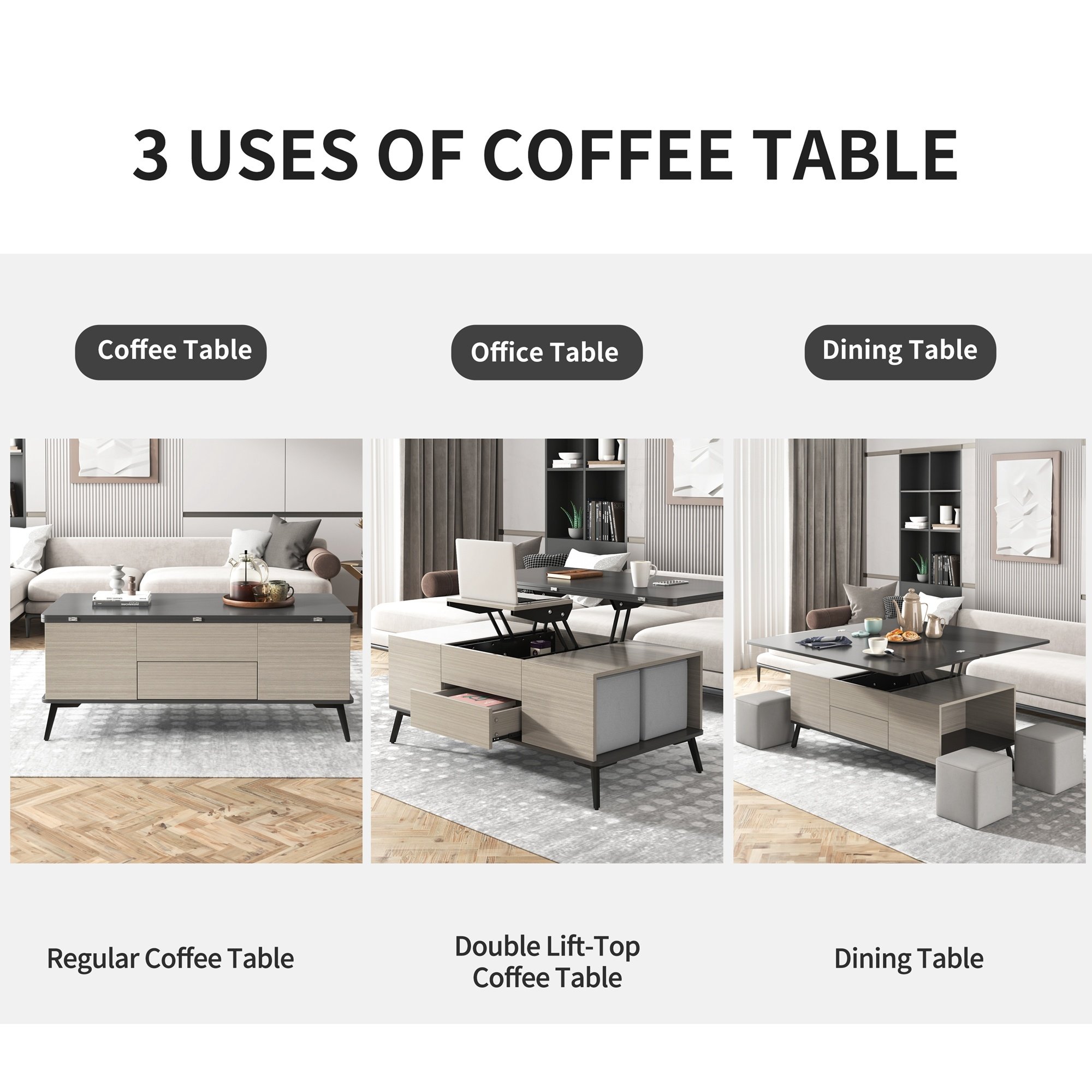 5 Pieces Lift Top Coffee Table Set with Storage Convertible Dining Table with OttomansThe 5-Piece Lift Top Coffee Table Set with Storage is a versatile and functional furniture set designed to maximize space and provide various uses. The set includes a lift-top coffee table, four ottomans, and features a hydraulic lifting function.