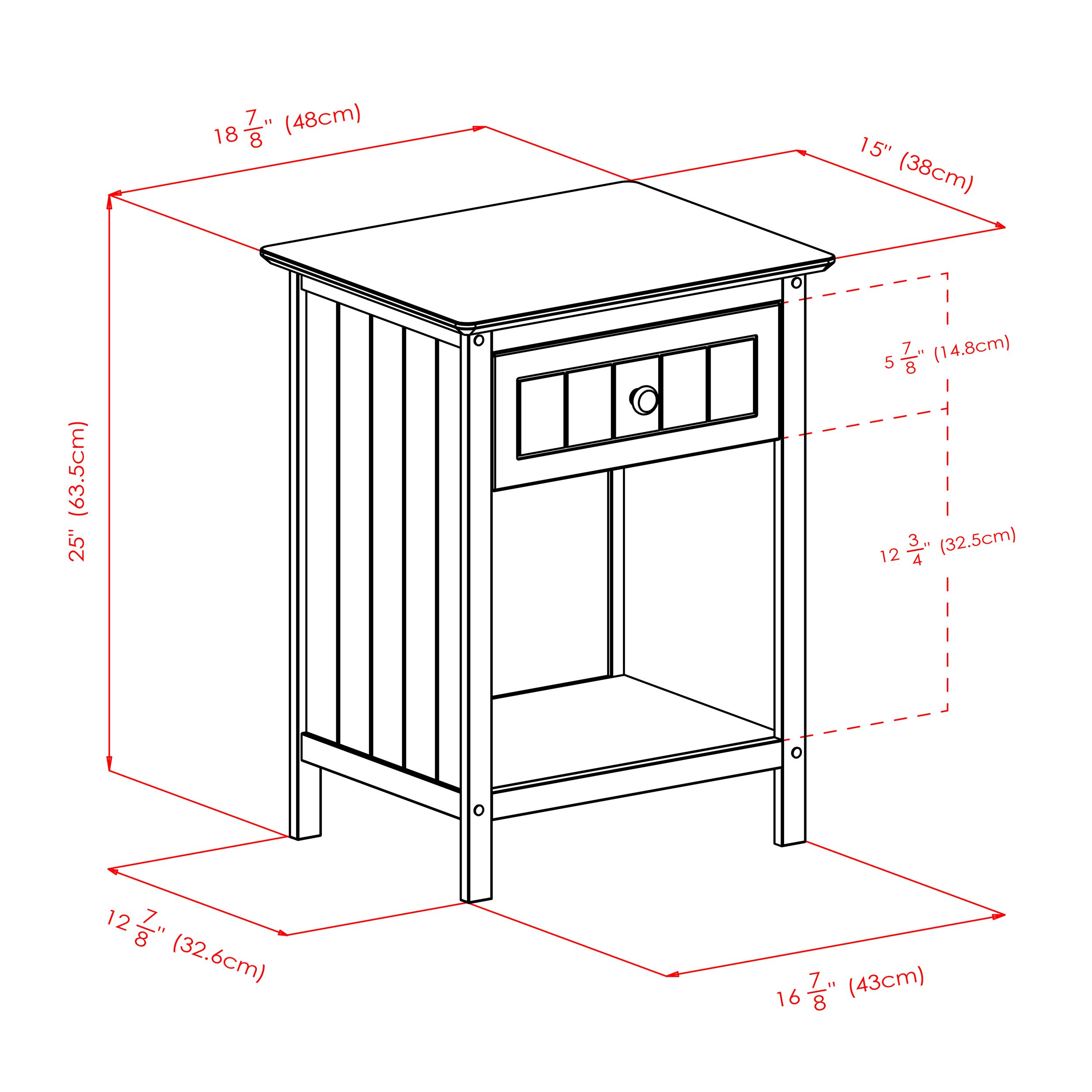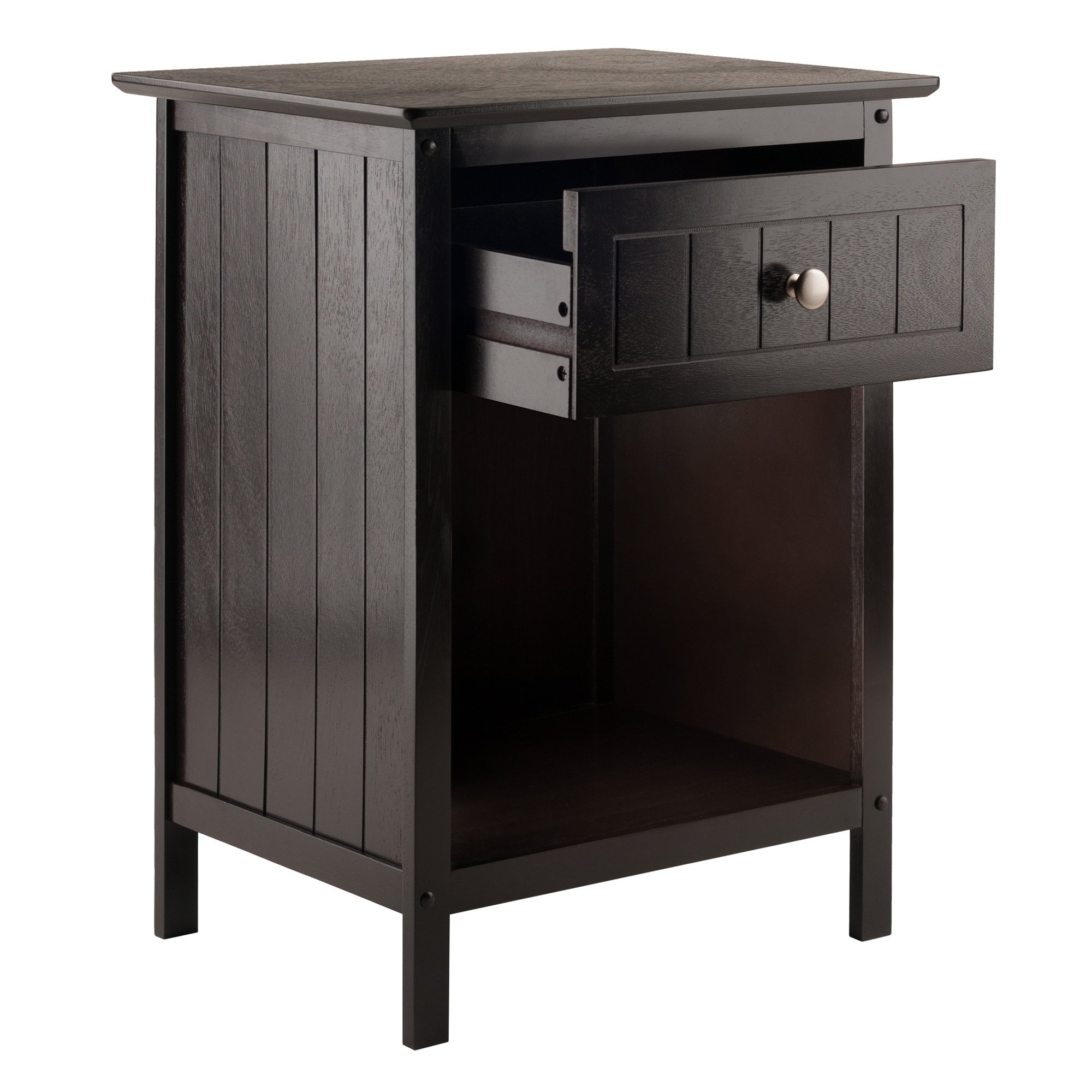 Wainscoting side-panels add warmth and charm to the Winsome Wood Blair Accent Table. Use as an end table in the living room or family room; as a bedside nightstand; or perhaps as a printer stand to add storage space to your home office. An open cabinet is great for keeping books or photo albums. In the office; use the shelf to store printer paper; files or catalogs. Keep TV remotes and personal electronic devices in the wide drawer; and place a lamp or vase on the tabletop to complete this homey and versatile piece. At 18.9'W x 14.9'D this compact table is perfect for apartments; dorm rooms; or anywhere you can use a side table with lots of storage space. Constructed of sturdy solid and composite wood in a dark coffee finish. Conveniently ships in one box and ready to be assembled. Replacement part request can be submitted directly to the manufacturer within 60 days from date of purchase.