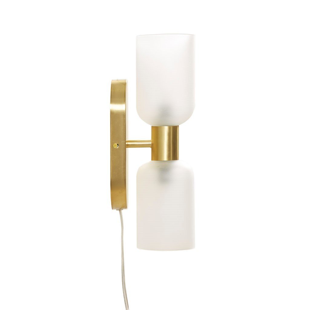 DESCRIPTIONWhether mounted horizontally or vertically, the Dove double tube wall sconce from Hampton Hill is a perfect way to bring elegant illumination to your mantel, bedroom, or entryway. The frosted cylinder glass shades provide a beautiful ambiance, while the plug-in design makes installation a breeze. Two type B bulbs are needed (not included).PRODUCT DETAILSSee belowOverall: 4.25"L x 5.75"W x 14"H2 Shades: 3.75"Dia x 5.75"H (2)Mounting Deck: 4"W x 1"D x8"HCord: 60"MATERIAL50% glass, 50% ironBase: 100% ironBase Finish: GoldShade: Glass