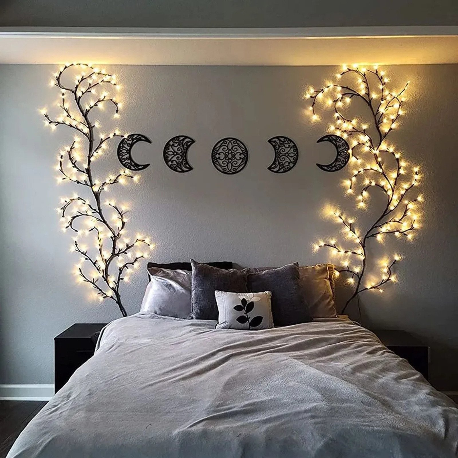 4.EASY TO USE: The lighted branches vine comes fully assembled, all you need to do is spread the branches, stems and twig apart and be creative to shape them, Vine lights does NOT come with stand or item to adhere to wall. We recommend that you use rope hooks (0.31 inch), nails, suction cups, scotch tape, etc. to hang on the wall.