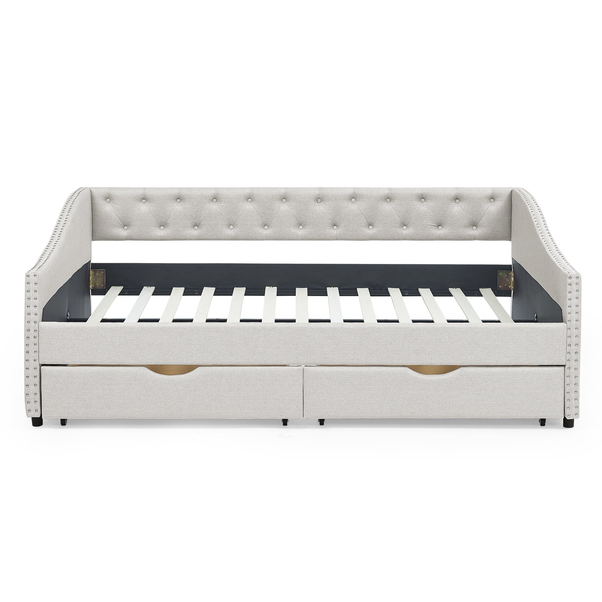 Full Size Daybed with Drawers Upholstered Tufted Sofa Bed, with Button on Back and Copper Nail on Waved Shape Arms, Beige (80.5''x55.5''x27.5'')