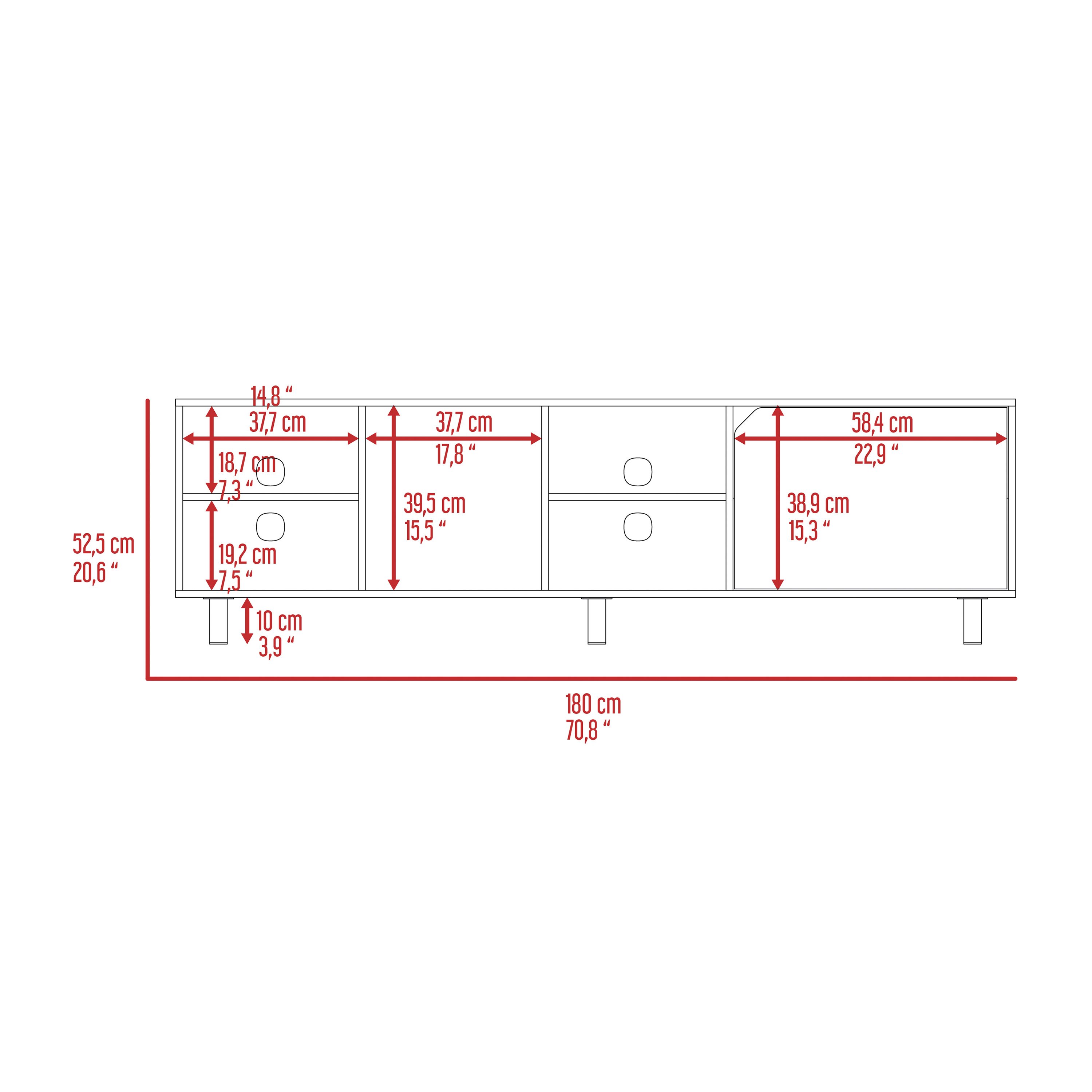 Romance CopyThe new product of the collection, the Harwich TV Stand, is excellent for you if you have always dreamed of an ideal spot to organize your new TV with a modern touch and functionality due to its drawers and shelves suitable for storage. Its one-of-a-kind and ergonomic design make it ideal for any environment. It features back holes on the inside to keep your cables orderly.Product DetailsSet includesOne (1) TV standDimensions20.6 inches high x 70.8 inches wide x 13.7 inches deepFinish ColorLight OakMaterialsManufactured woodNumber of shelves5Number of doors1