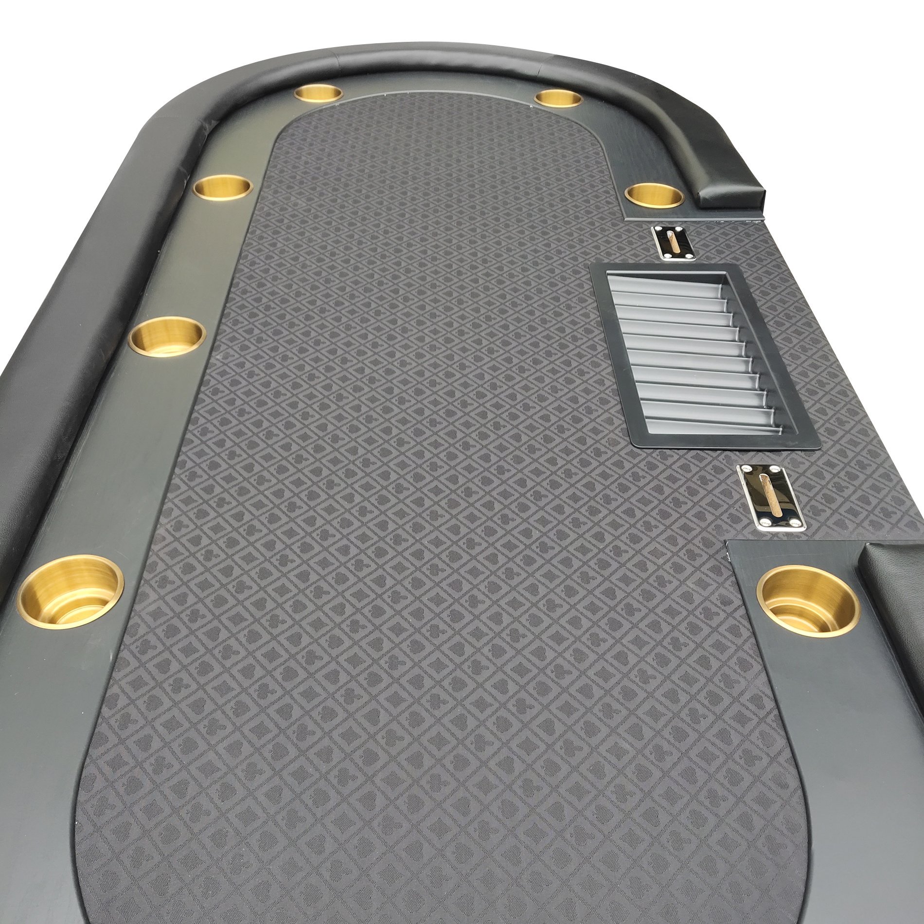 Playing SurfaceOval Shape, 96inch, Sit Up To 10 Players ( 1 dealer included ), Comes with black wooden texture racetrack, and high-quality diamond patterns felt, allowing cards to glide effortlessly across the table.
