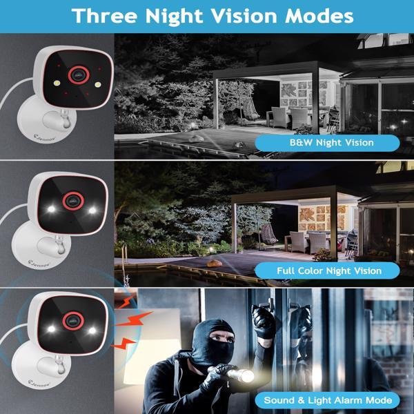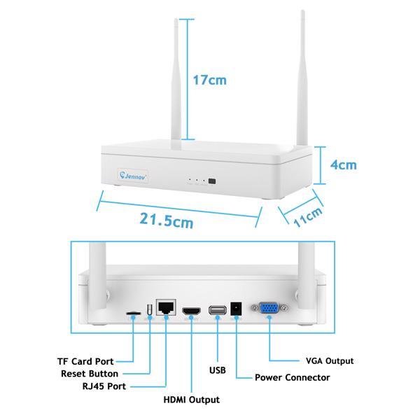 2K Super HD Smooth VideoThe picture quality of the camera is exceptional. The clarity and sharpness of the images captured. Clear 2K high definition video with this security camera. Easily see what your baby is holding or what your pet is playing with.Livestream with Color Night VisionNever miss a thing that goes on, even at night thanks to the integrated spotlight & IR system on this indoor camera which provides 30 feet of 2K HD video & color night vision.Two Way Audio, Communicate with EaseBuilt-in microphone and speaker, you'll be able to listen and speak through the wireless camera, easily connect with family , talk to pets or even scare off the unexpected person no matter where you are.Human Motion Detection & Real Time AlertsThe security camera can reduce false alarms with a human filtering function and receive instant alerts on your phone when motion is detected. Alert notifications will be sent to your phone immediately if human motion is detected. Jennov home camera supports adjusted sensibility to ensure you won't be disturbed by frequent alarms.Built In Siren, Deter IntrudersWhen an intruder is found, Siren can be activated proactively. Scare off the unexpected person, keep your family safe with cameras by warding off intruders.Smart Detection ZoneThe smart camera lets you customize detection zones so you are only alerted to the movement that matters to you. It can reduce unimportant alarms and false positives.IP66 Weather ResistanceReady for any weather. Record 2K HD footage in rain, snow, or shine.Multi-users & Multiple ViewThis camera with phone app supports multi users to view simultaneously on iPhone and Android phones. You could share your indoor camera with friends and family for interesting moments. The "Eseecloud" APP can add multiple cameras, more convenient for you to view multiple areas of your home at the same time. Never miss any important moments when you are away from home.See What's Going on in Your HomeThe Jennov Cam is mini size and can be used for indoor security. You can put it on the table, on the shelf, and mount it on the wall/ceiling, etc. Through this wired indoor camera, you can control the situation in your home 24/7.Smart PlaybackThe NVR works perfectly and efficiently with cameras to provide 24/7 monitoring and recording for your home and business security surveillance. It allows for simultaneous recording of all channels, viewing of live video, playback of recorded events, backup of recorded footage, and remote access to the system via smartphone or tablet.Smart Recording ModesSave your time and energy over general motion detection. You can also set and apply general motion detection or 24/7 recording as needed.NVR Multi-Language SupportThe NVR support 11 languages ,Korean, Japanese, Portuguese, Spanish, German, etc.