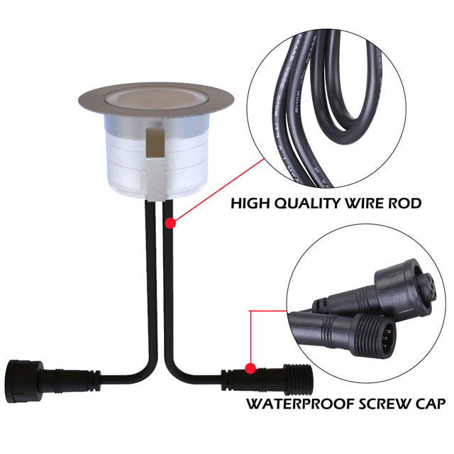 4.Simple to install &convenient to use. Drill holes, push led deck lights in, connect cables.Cut out size for hole is Φ1.38"(35mm),no need for embedded part. Waterproof plugs could be linkable between 2 deck lights ,length of 2 deck lights is 2.86ft(1m),10 deck light is 28.5ft(10m).Use the remote control or App on the mobile phone to control .