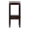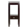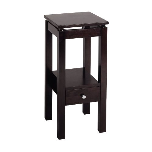 Featuring the sleek and stylish Linea design; this telephone stand has a shelf perfect for stacking phone books; and a small drawer to keep a notepad and pen conveniently tucked away. Shelf size 13.30" x 9.70". Clearance between table apron and shelf is 12.40". Combination of solid and composite wood in Dark Espresso finish. Assembly RequiredOverall Accent Phone Table size is 13.30" Wide x 13.60" Deep x 29.49" High.Shelf size is 13.30" x 9.7" with 12.40" Clearance. Inside drawer dim 6.9"W x 8.7"D x 2.8"HConstruction with combination of solid and composite wood in espresso finish. Assembly Required.nullnullnull This product meets the oversized requirement per UPS/FedEx. The shipping weight reflected is the dimensional weight. This product also meets the large package requirement per UPS/FedEx. The estimated shipping cost will include this fee. Large package is $70.00; applied when length plus girth [(2 x width) + (2 x height)] combined exceeds 130 inches. Additional Handling charge of $10.50 applied where a package's longest side exceeds 48 inches in length; the second longest side exceeds 30 inches in length; or total weight is greater than 70 lbs.This product meets the oversized requirement per UPS/FedEx. The shipping weight reflected is the dimensional weight. This product also meets the large package requirement per UPS/FedEx. The estimated shipping cost will include this fee. Large package is $70.00; applied when length plus girth [(2 x width) + (2 x height)] combined exceeds 130 inches. Additional Handling charge of $10.50 applied where a package's longest side exceeds 48 inches in length; the second longest side exceeds 30 inches in length; or total weight is greater than 70 lbs.