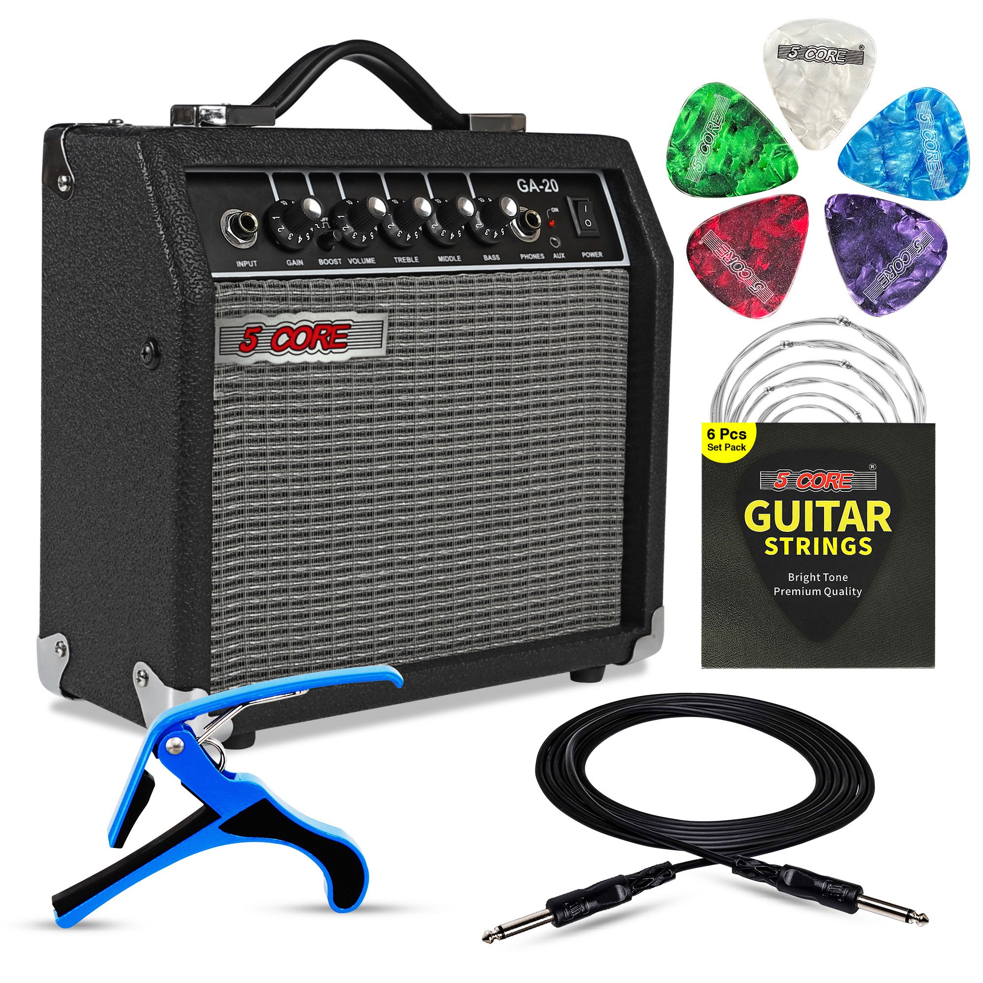 | 3-Band EQ 5 Core GA 20 has three band equalize you can control. The Treble/ Middle/ Bass controls help you shape the high and low frequencies of your guitar tone. For the performer who wants ultra-compact convenience at a moment's notice, the GA 20 is just the right small amp with just the right sound. Perfectly portable, it delivers great tone and features for an electric guitar and a mic ideal simplicity and flexibility for a variety of musical and basic public address uses at small gigs and gatherings. The 5 Core GA 20's convenient front-panel inputs include a standard inch jack for an instrument. This amp is portable and easily transportable. It is a great companion to have for small performances as well as a rehearsal tool in your bedroom. | HEADPHONE JACK & AUXFor convenient personal listening at any time that won't bring the house down on anyone else within earshot, this amp features a headphone output jack.The 5 Core Bass Guitar Amp's convenient front-panel inputs include a standard inch jack for an instrumentAuxiliary port for MP3 players, headsets and Microphones | Great Sound Compact, easy to use and versatile enough for any style of guitar playing, the 20-watt GA-20 is an ideal choice for your first practice amp. Straightforward controls, cool effects and versatile amp voicing make it easy to dial in just the right sounds for rock, blues, metal, country, jazz and more. |
