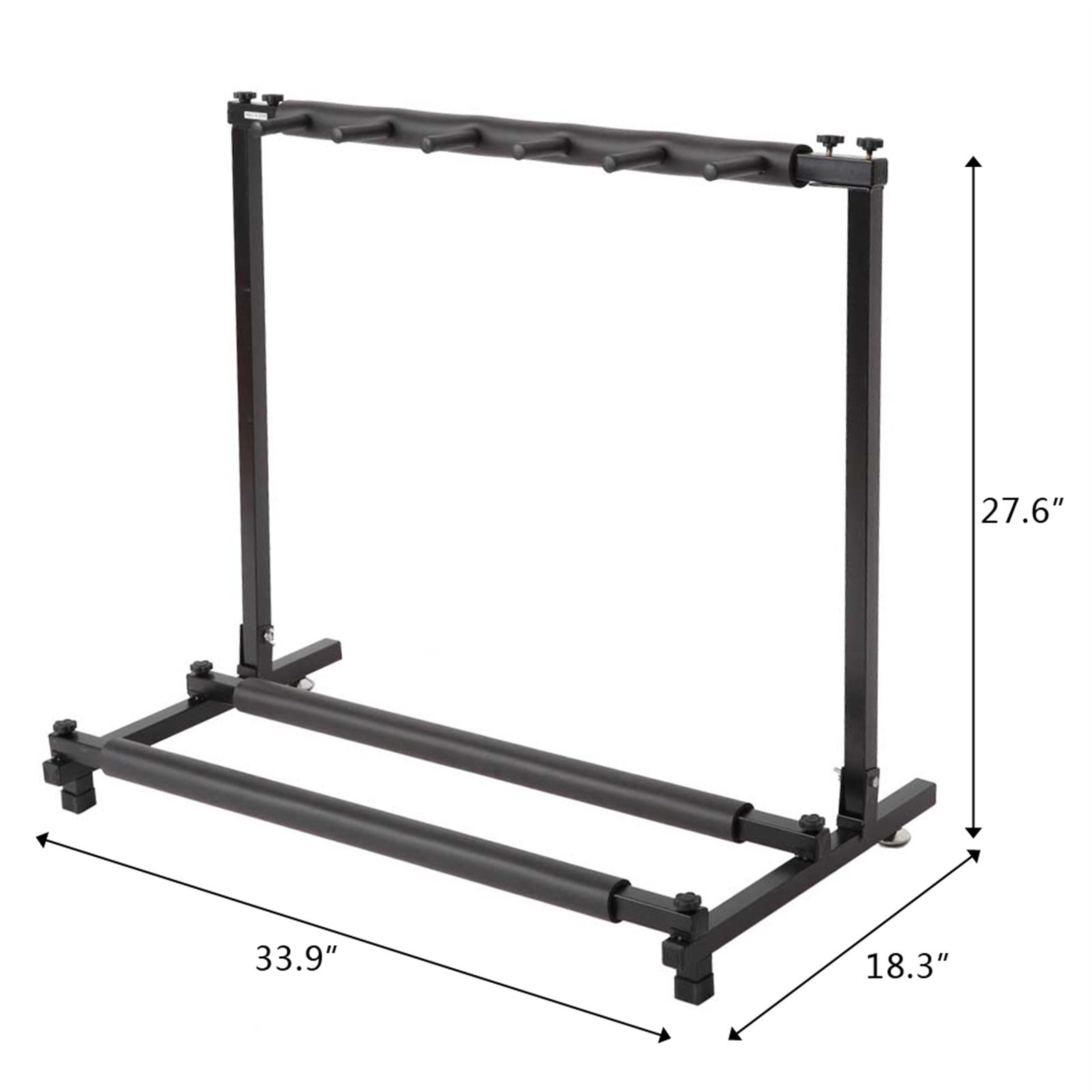 Introductions:If you are a collector of guitar, you must have the storage problem. This Triple Folding Multiple Guitar Holder Rack Stand can help you solve this problem. Made of new and high quality, it is a very strong and sturdy tubular guitar stand. This rack would be possible to hold up to 5 guitars including acoustic guitars, electric guitars and bass guitars. Besides, the stand boasts rugged square-tube construction and holds your acoustic guitars securely. And it also can be folded up for easy transport. Order it now, and you will receive all these benefits.Features:1. Unique design and high quality2. Very strong and sturdy guitar stand3. Hold up to 5 guitars4. This rack would be possible to hold all guitars including acoustic guitars, electric guitars and bass guitars5. Made according to exacting specifications with finish-safe soft black neoprene rubber tubing to protect your guitars6. Folded up for easy transportSpecifications:1. Width Between Peg Holders: 2.75"2. Dimensions:860*465*700MM 3. Color: Black4. Material: Iron5. Weight: 97" / 2750g6. Total Width: Aprox. 18.11"Package Includes:1 x 5 Triple Folding Multiple Guitar Holder Rack Stand