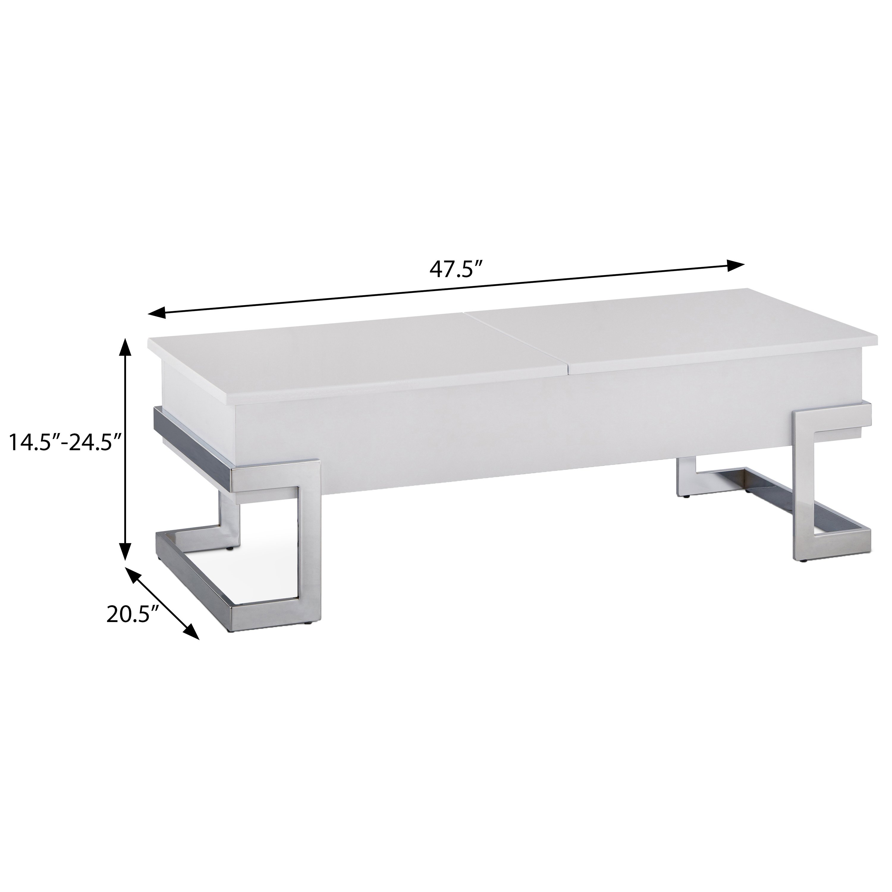 Romance CopyEnhance your living space with this sleek and modern coffee table, boasting two spacious inner storage compartments to keep your items organized and out of sight. Its unique half lift and half gliding lid design exudes contemporary elegance, while the sleek chrome metal legs add a touch of sophistication to your decor.Product DetailsSet includesOne (1) coffee tableDimensions24.5 inches high x 47.5 inches wide x 20.5 inches deepMaterialsMetal, Wood, PVC, Composite WoodFinish colorWhite High Gloss and Chrome
